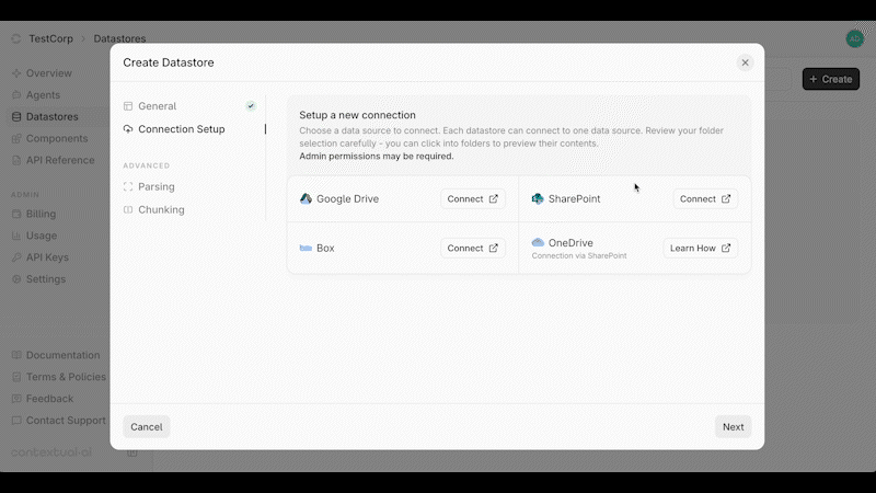 Log in through the Contextual AI UI and follow these steps to configure SharePoint as a data source.You can sync OneDrive data via the SharePoint connector. For detailed instructions, please see Connecting to OneDrive via Sharepoint